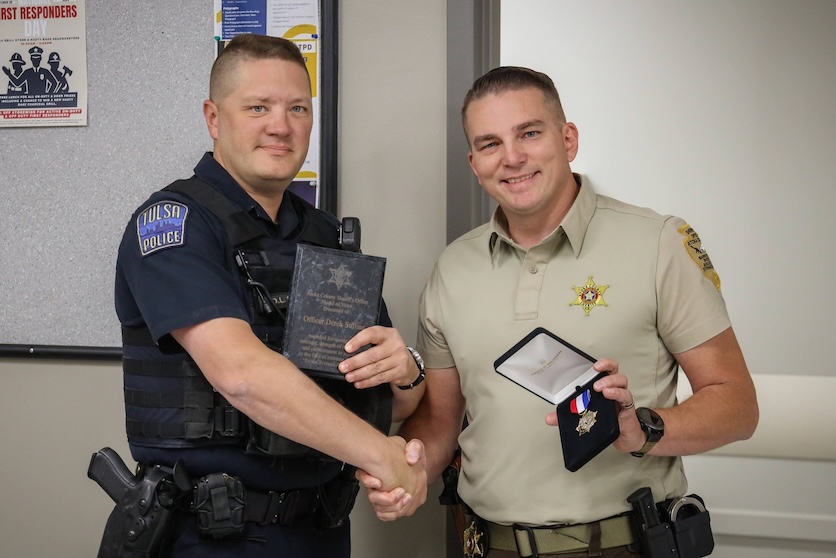 Tulsa, OK – On Tuesday, Tulsa Police Officer Derek Sullins was awarded a Medal of Honor by Atoka County Sheriff Kody Simpson and received commendations and challenge coins from the Stringtown Police and Atoka Police. Officer Sullins was recognized for his act of bravery on May 30, 2025.